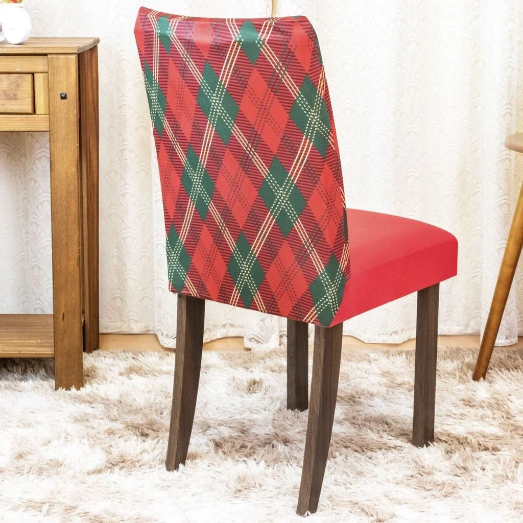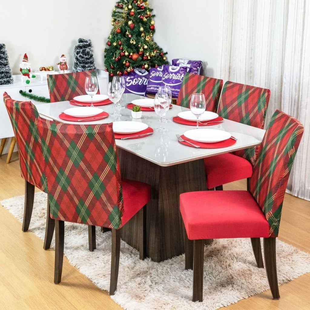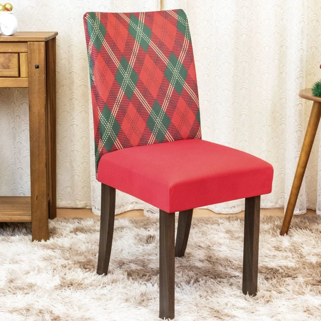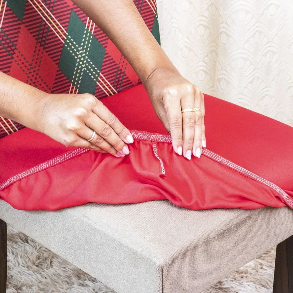 As capa de cadeira natalina elastex possui elástico em sua composição e se adaptam à diversos modelos de cadeiras.