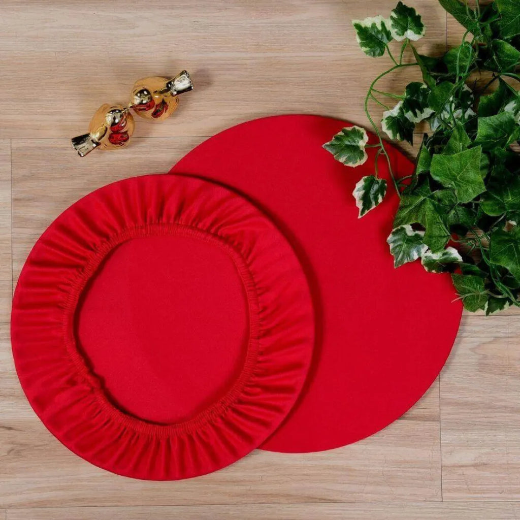 - Capa Sousplat Redondo p/ Lugar Americano: 35cm, Cor Vermelho tecido 100% Poliéster+Elastano, com acabamento em elástico embaixo para facilitar a lavagem